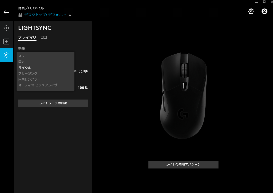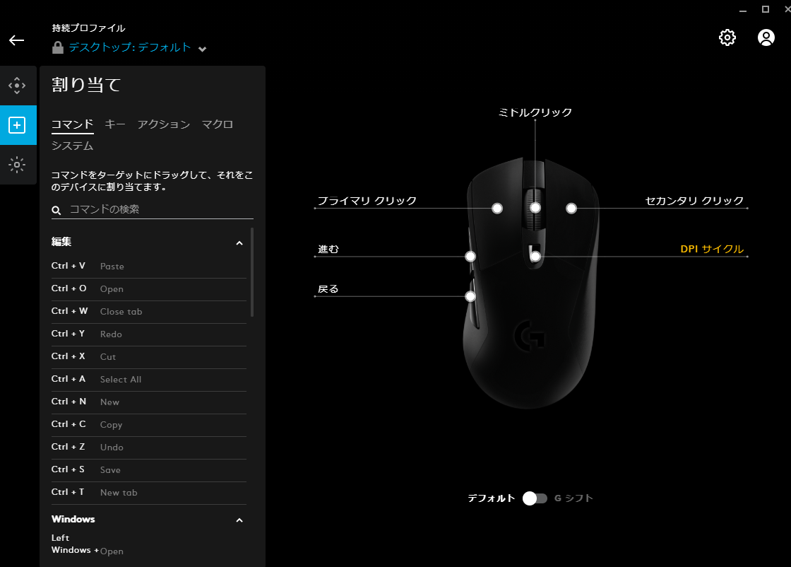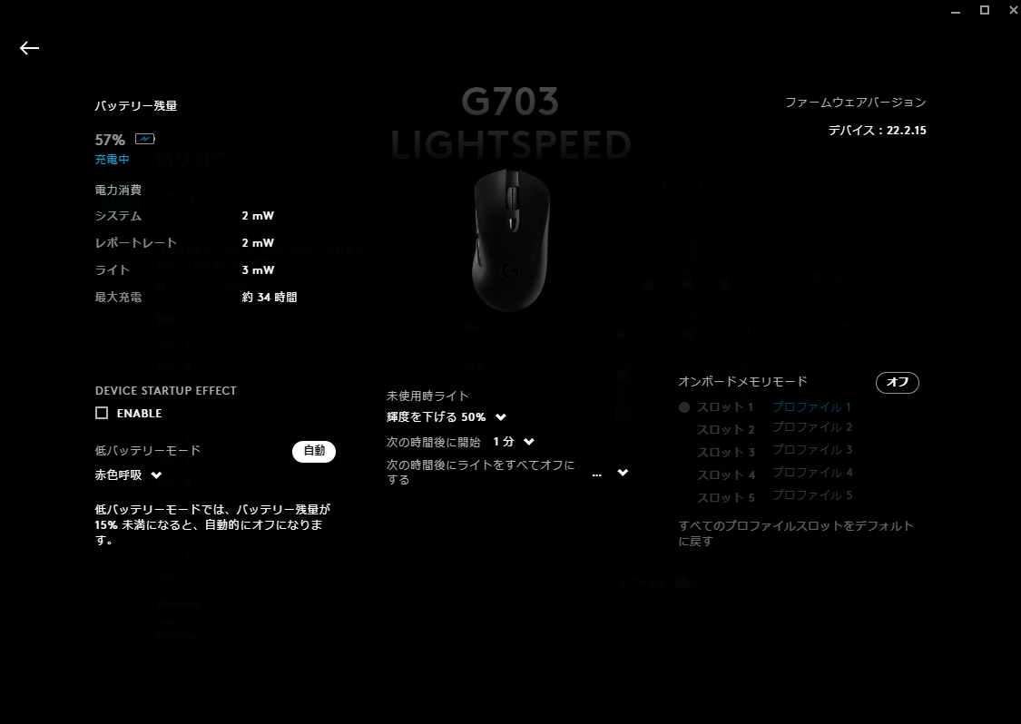 G-HUBというPCのソフトで電池残量の確認や感度(DPI)の変更・キーの割り当て・RGBライトのカスタマイズなどが出来ます。これはG703hもG Proも同じように操作で設定できます。